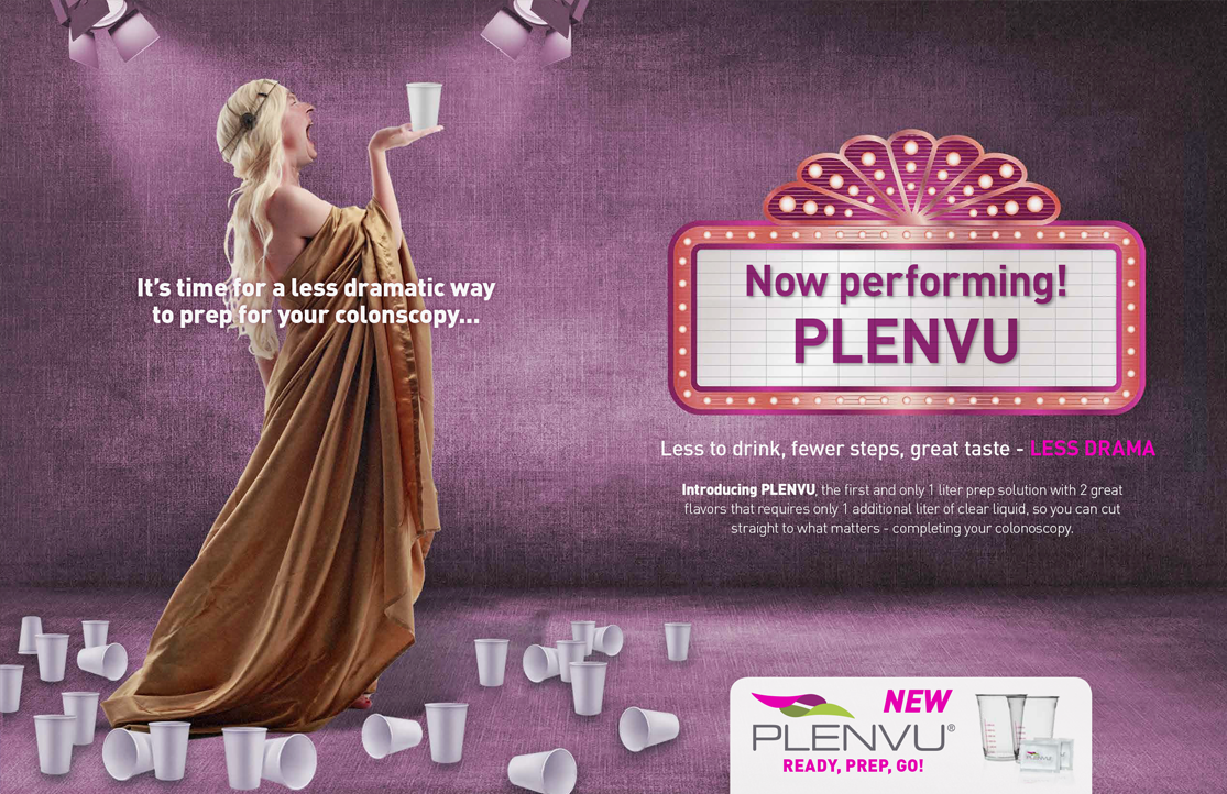 This ad cleverly uses theatrical imagery to contrast the old, cumbersome prep methods with the streamlined, stress-free approach PLENVU provides. With only 1 liter of prep solution needed, accompanied by an additional liter of clear liquid, patients can now focus on the critical part: completing their colonoscopy with minimal drama and maximum comfort.
